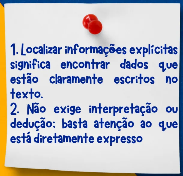Para encontrar uma informação "explícita", ou seja, aquela informação que está escrita no texto exige que o leitor consiga identificar nomes, datas, lugares ou qualquer elemento textual que não necessite de interpretação adicional.