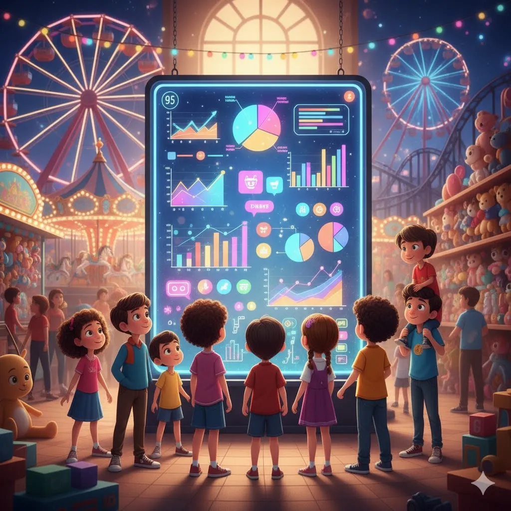 Observe cada gráfico colorido e veja qual brinquedo está sempre com a fila mais longa. Será a montanha-russa ou o carrossel? 🐴 Este é o nosso desafio do dia: aprenda a identificar e interpretar os dados de cada gráfico para se tornar um mestre dos números!